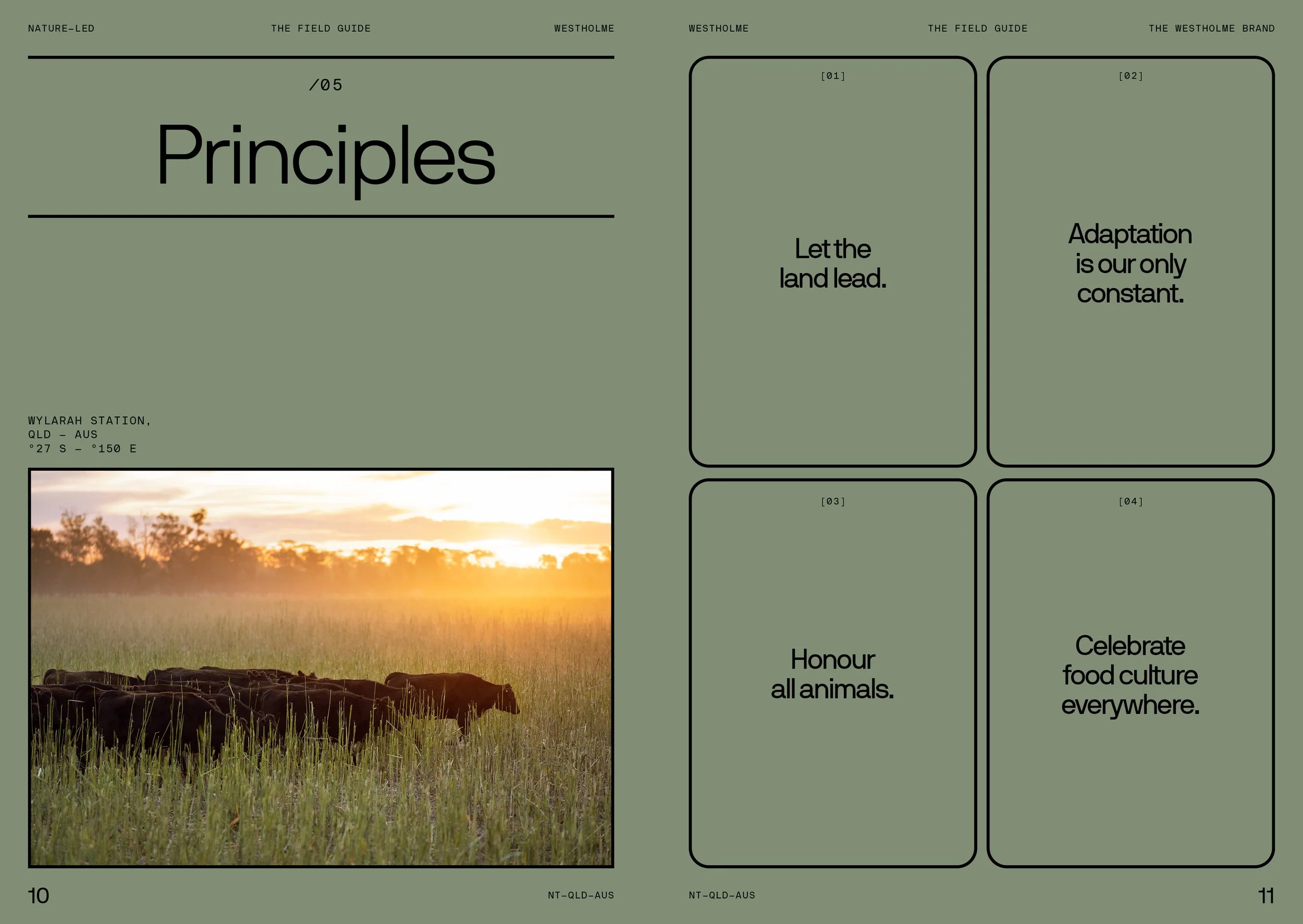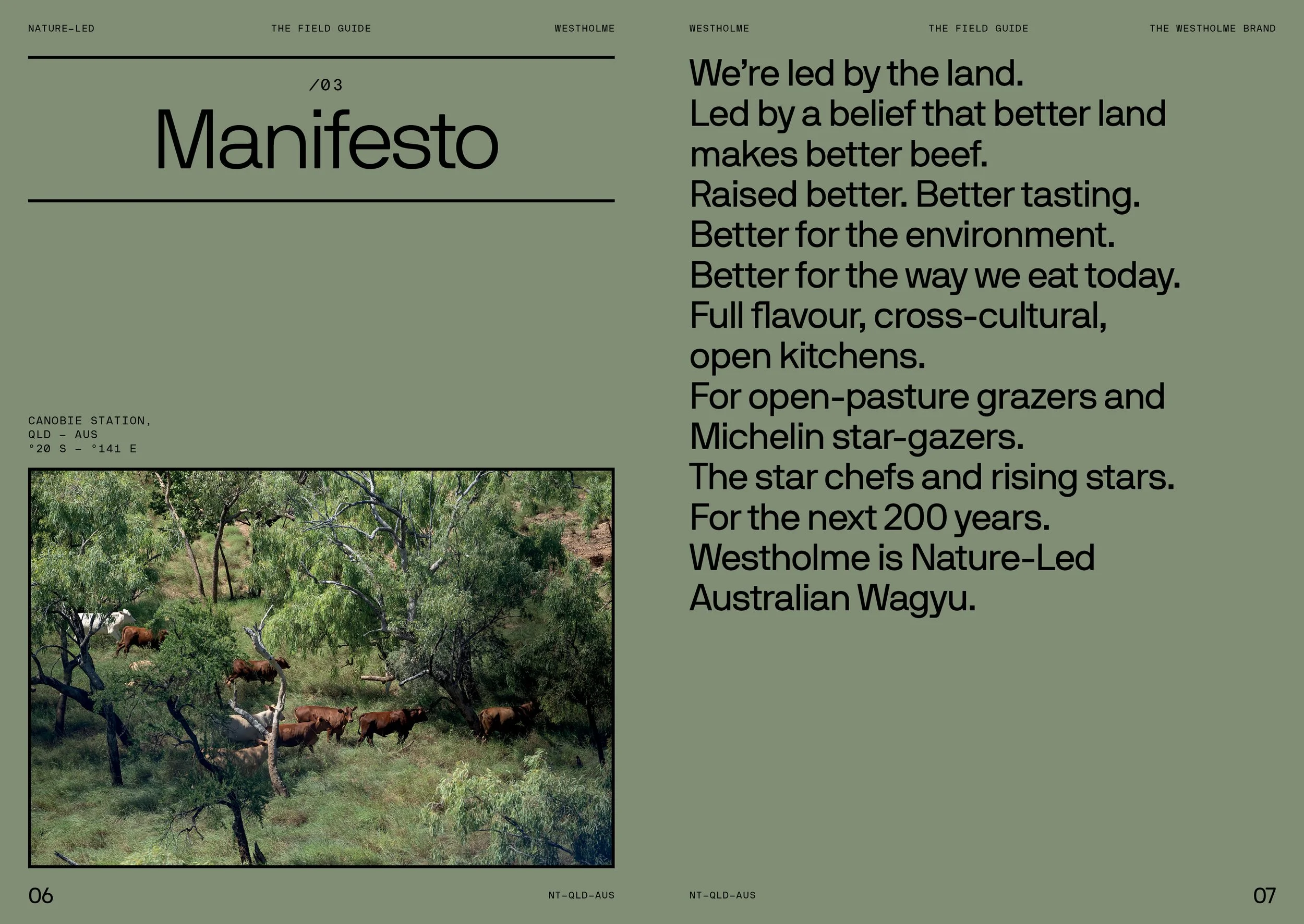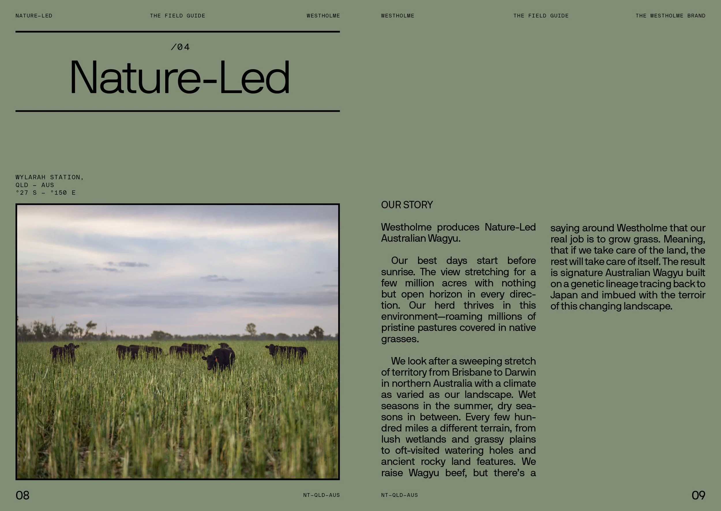 Repositioning Westholme meant taking the conversation out of the steakhouse and closer to food culture’s mainstream. Conversations with sustainability scientists, native grass experts, and agriculturilists steered me towards a positioning centered around the brand’s greatest asset—16 million acres of well-stewarded country in Australia’s rugged north. This thinking birthed a new global trademark, Nature-Led.