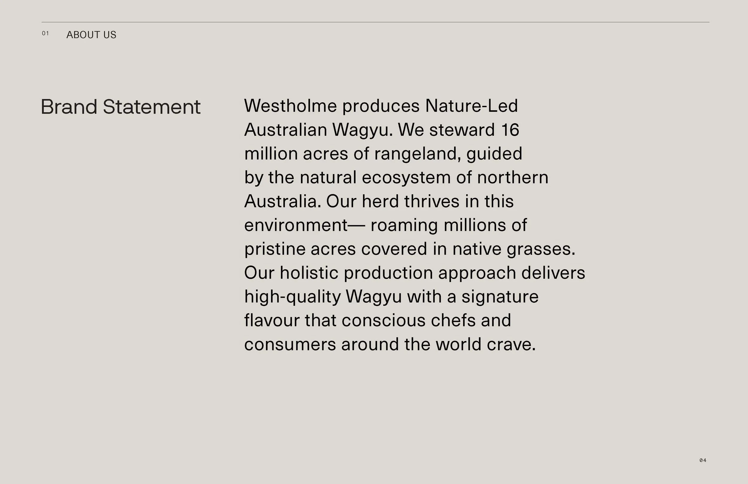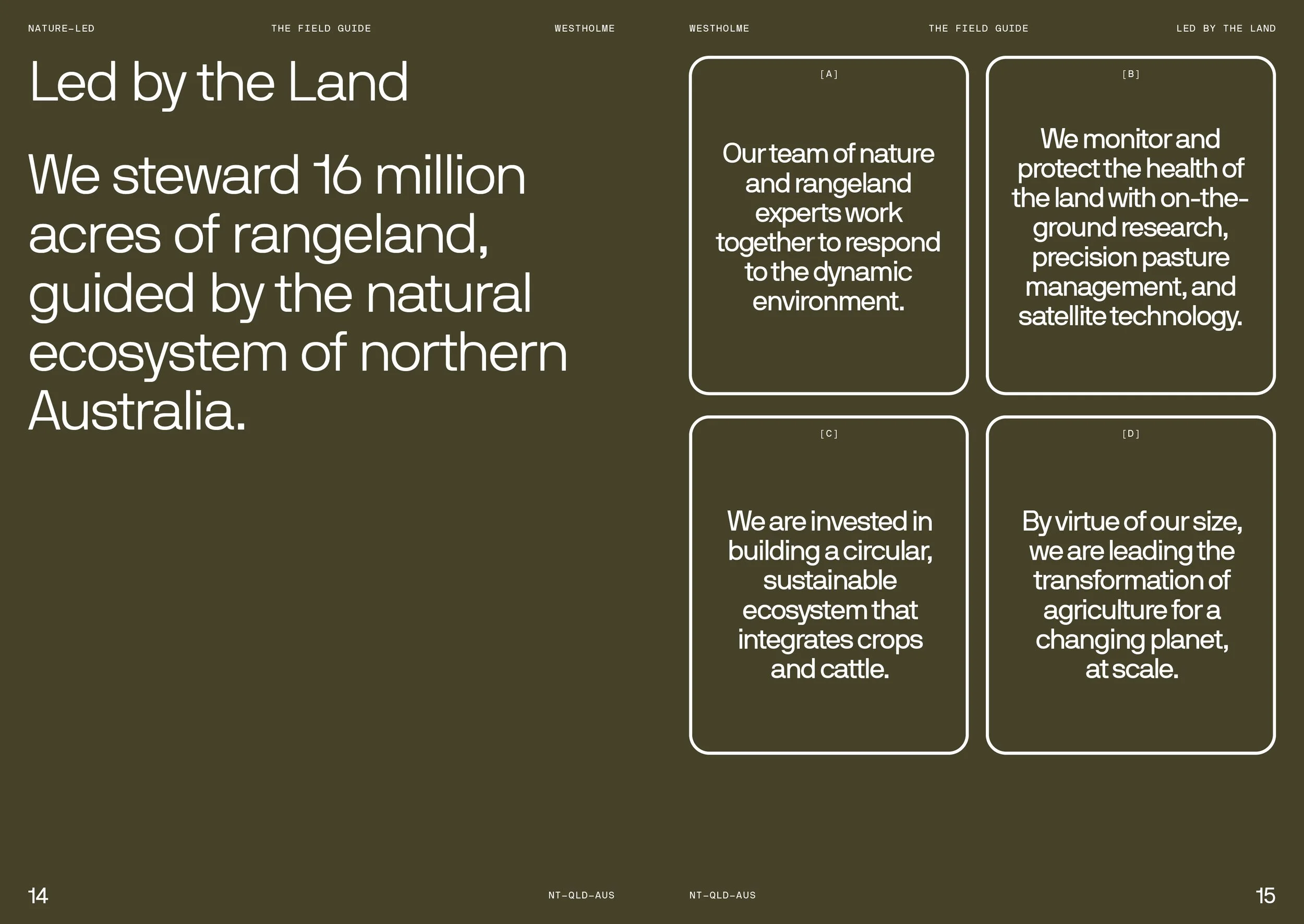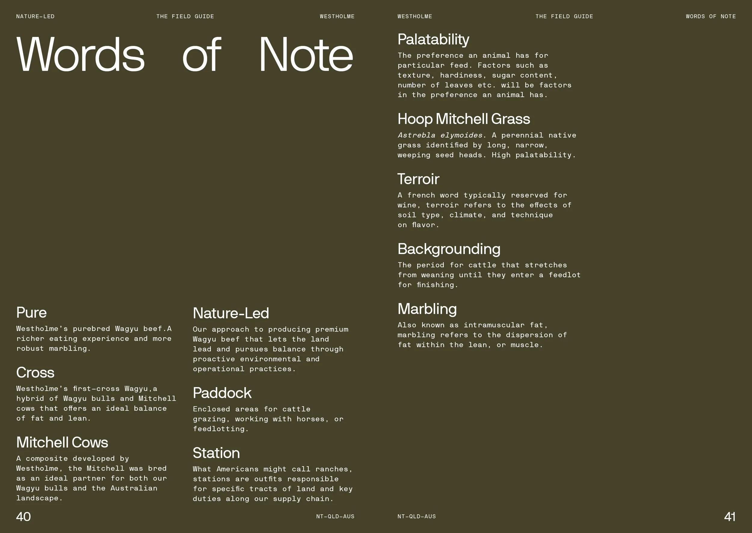 Repositioning Westholme meant taking the conversation out of the steakhouse and closer to food culture’s mainstream. Conversations with sustainability scientists, native grass experts, and agriculturilists steered me towards a positioning centered around the brand’s greatest asset—16 million acres of well-stewarded country in Australia’s rugged north. This thinking birthed a new global trademark, Nature-Led.